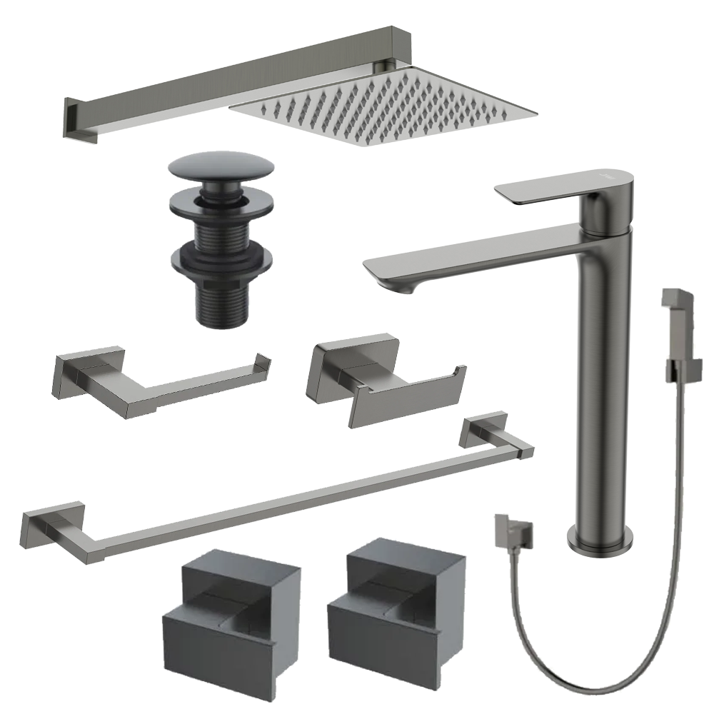 1 Chuveiro Quadrado Slim 20x20 Com Braço De Parede Grafite - Jiwi - WJ-DC-20-Q-CZEWJ-BCP-Q-CZ